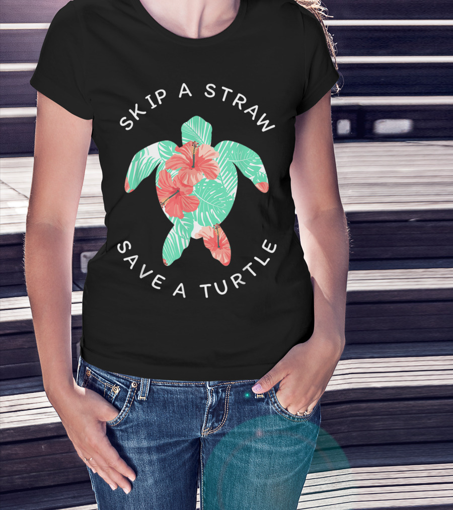 Skip A Straw Save A Turtle Hawaiian Floral Conservation T-Shirt
