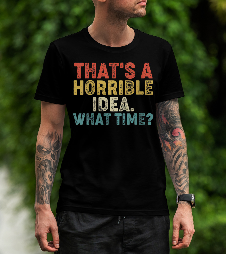 The THAT'S A HORRIBLE IDEA WHAT TIME? T-shirt is designed for everyday wear and a consistent fit. Fabric is pre-shrunk ring-spun cotton with durable stitching. See the size chart below for exact measurements.