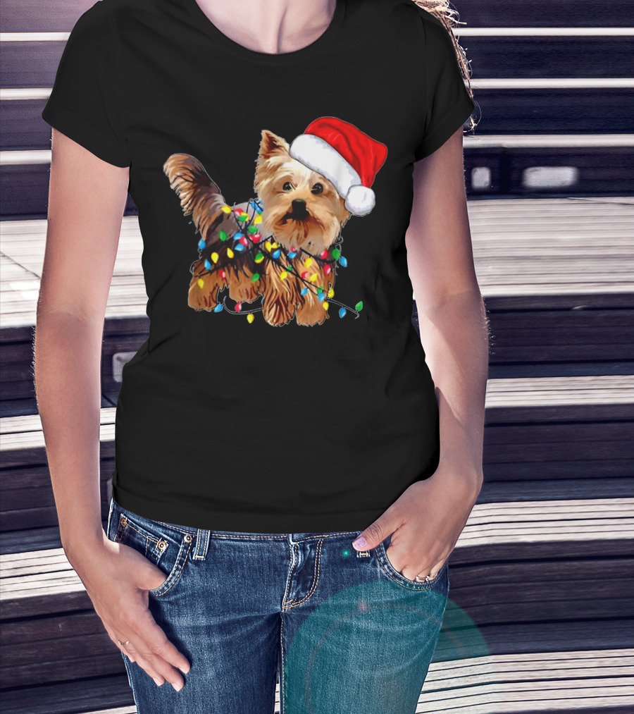 Yorkie Christmas Lights Santa Hat T-Shirt