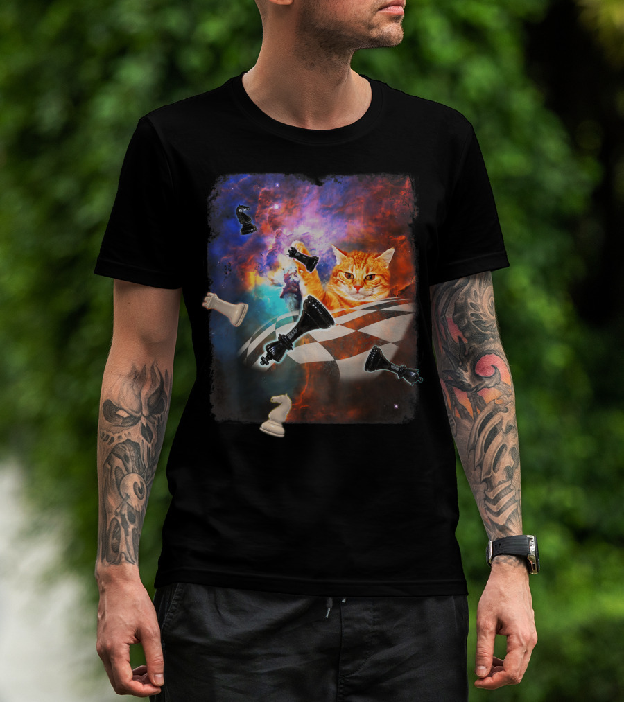 Chess Cat Floating Between Stars And Nebula With Chess Pieces T-Shirt