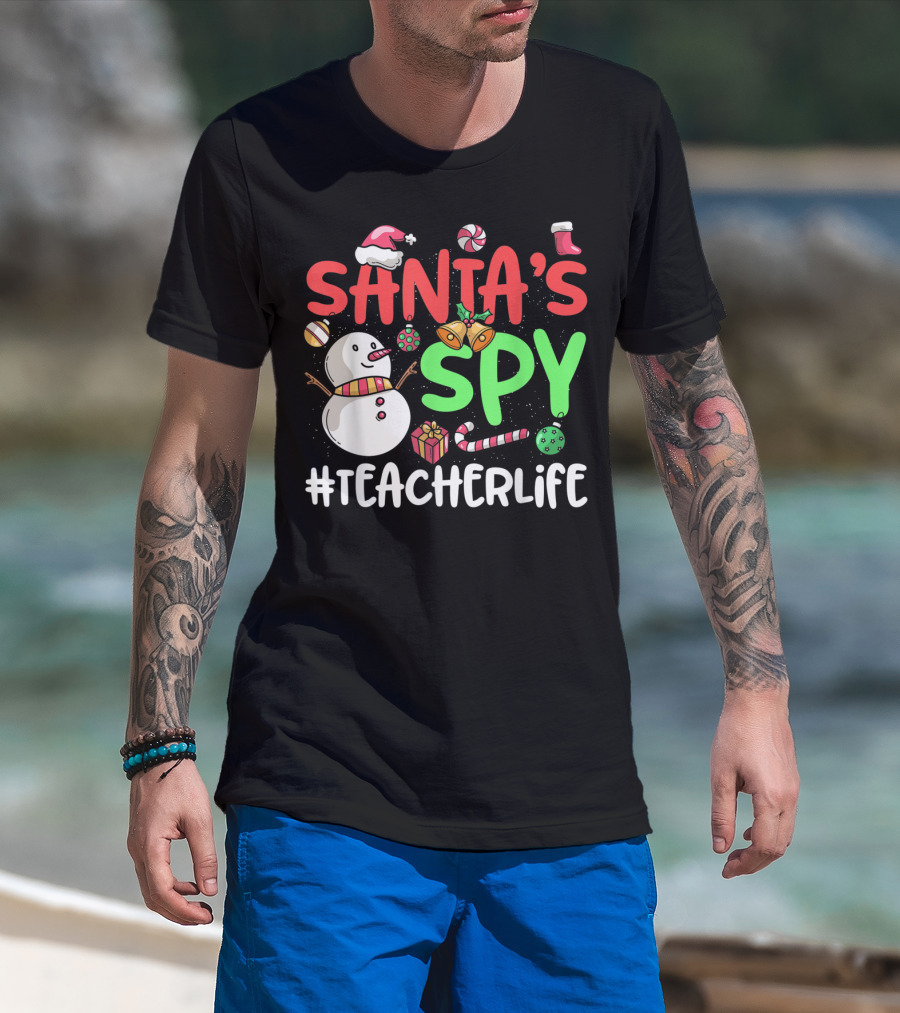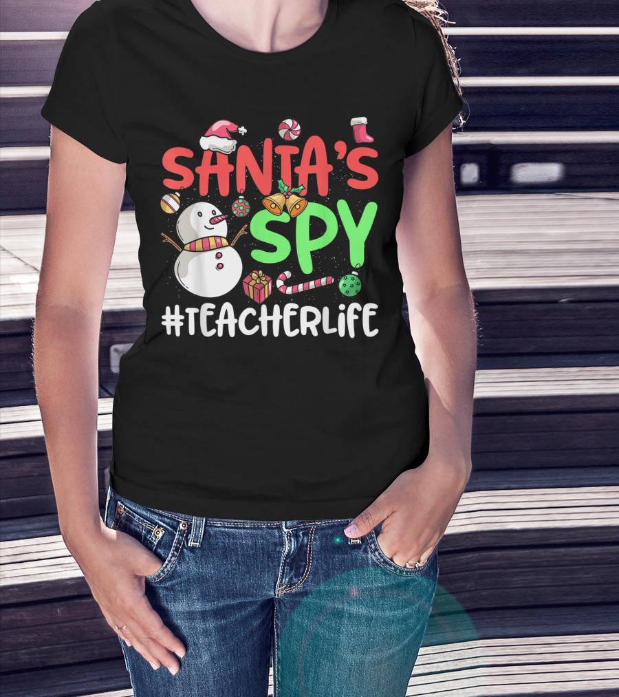SANTA'S SPY #TEACHERLIFE Snowman Candy Canes Bells Christmas Elements T-Shirt