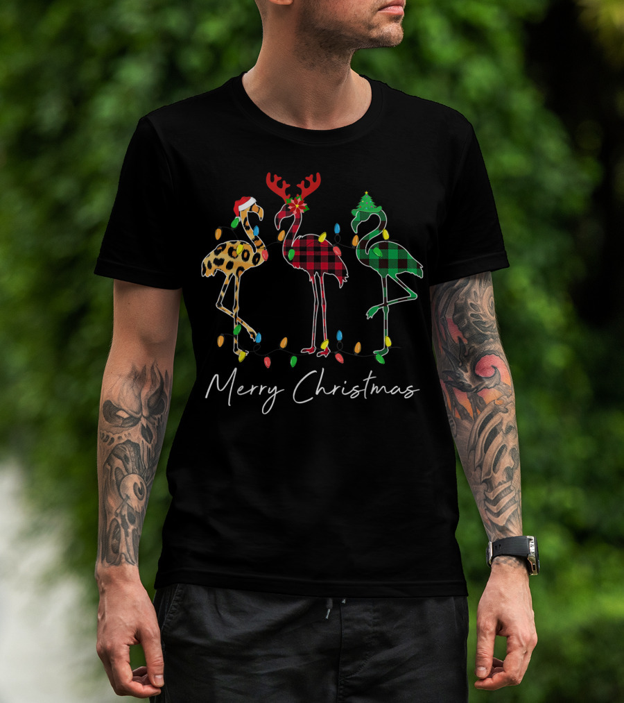 Merry Christmas Flamingo Santa Hat Reindeer Horns Xmas Light T-Shirt