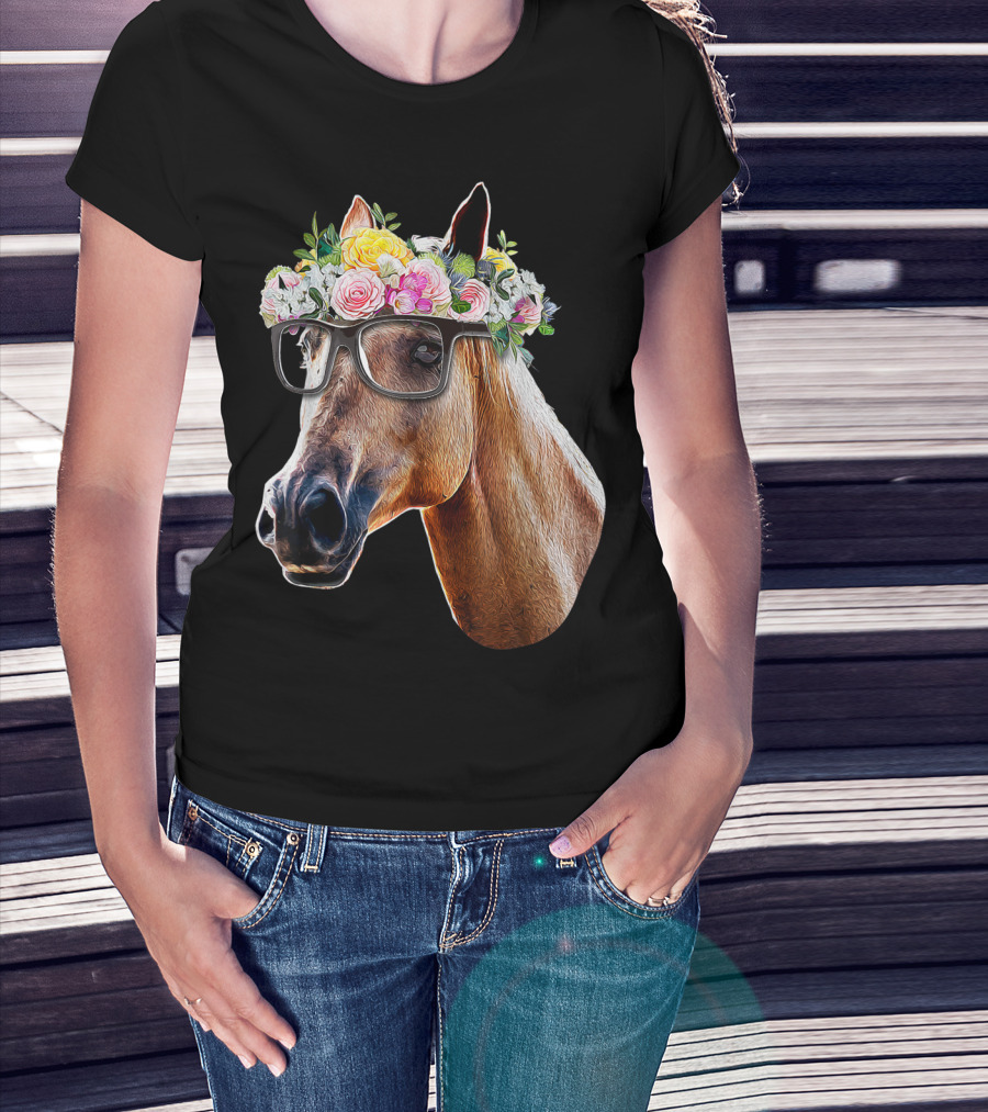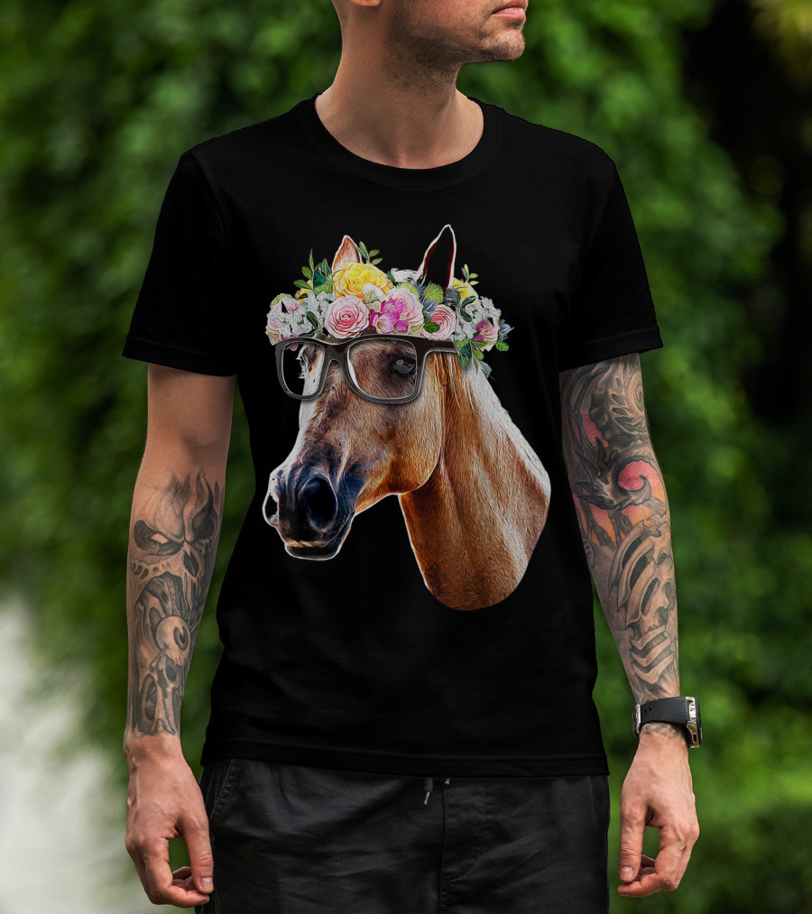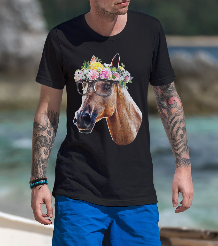 Floral Horse With Glasses Equestrian Farm Riding T-Shirt