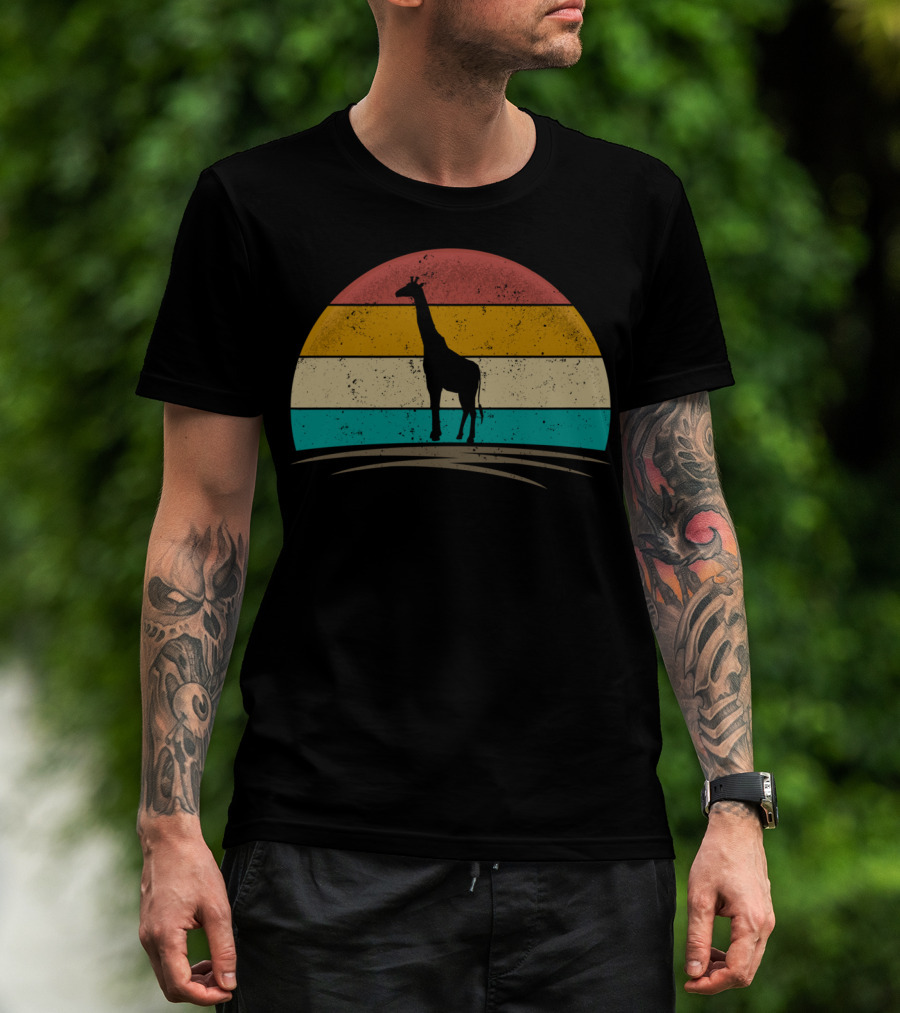 The Vintage Giraffe Distressed Sunset Silhouette Giraffe Stripe Retro T-shirt is designed for everyday wear and a consistent fit. Fabric is pre-shrunk ring-spun cotton with durable stitching. See the size chart below for exact measurements.