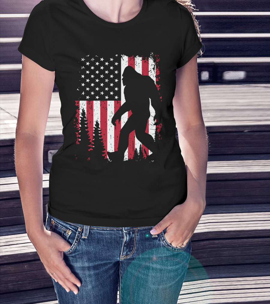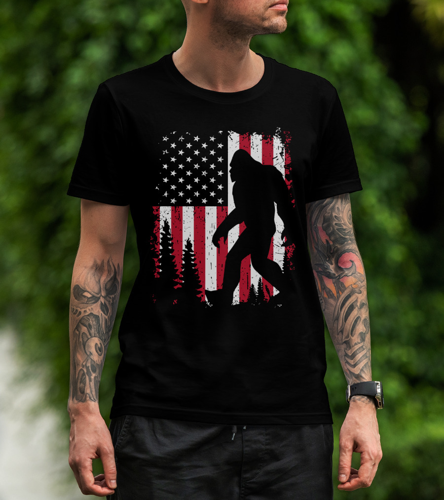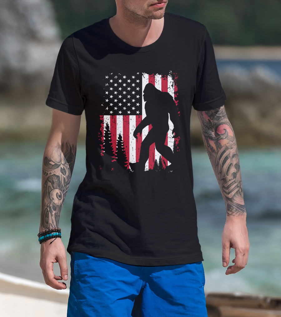 Bigfoot Walking Across American Flag With Forest T-Shirt