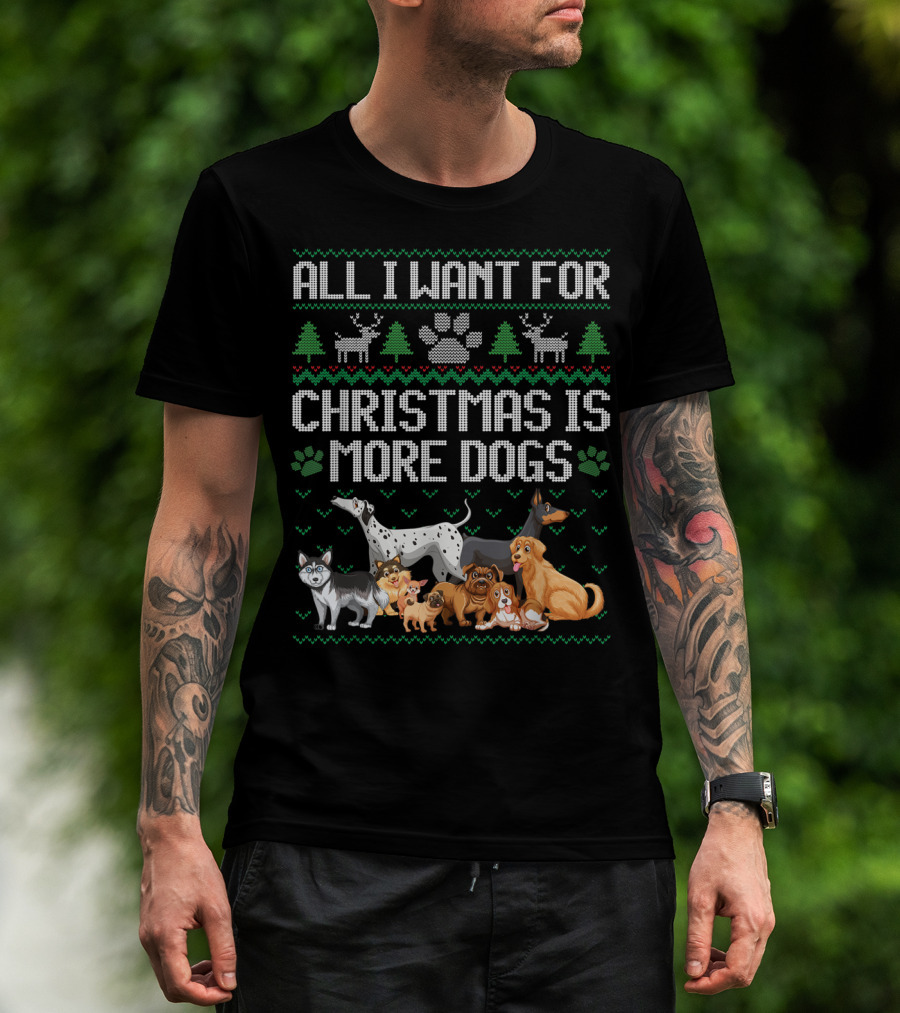 All I Want For Christmas Is More Dogs Paw Print Reindeers Trees Ugly Christmas T-Shirt