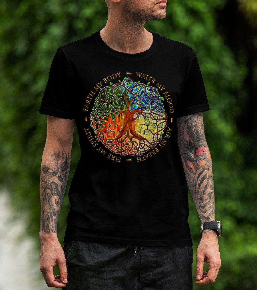 The Yggdrasil Tree of Life Earth My Body Water My Blood Fire My Spirit Air My Breath T-shirt is designed for everyday wear and a consistent fit. Fabric is pre-shrunk ring-spun cotton with durable stitching. See the size chart below for exact measurements.