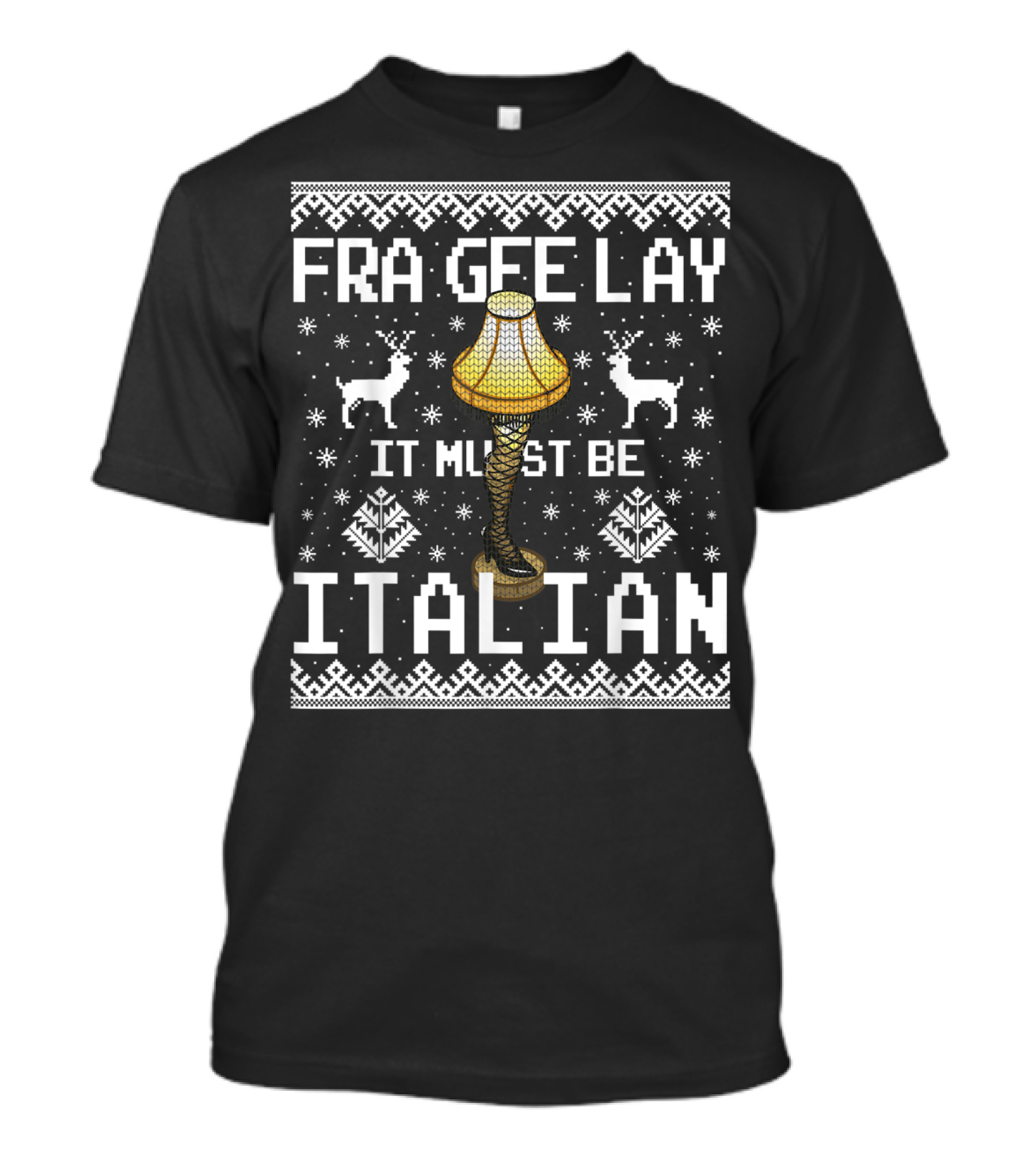The Frageelay It Must Be Italian Christmas Leg Lamp T-shirt is designed for everyday wear and a consistent fit. Fabric is pre-shrunk ring-spun cotton with durable stitching. See the size chart below for exact measurements.