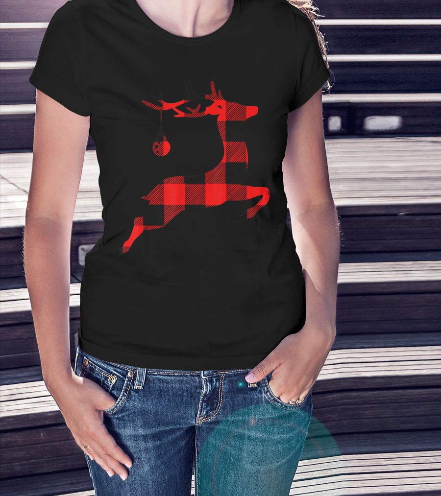 Festive Black And Red Plaid Reindeer Silhouette T-Shirt