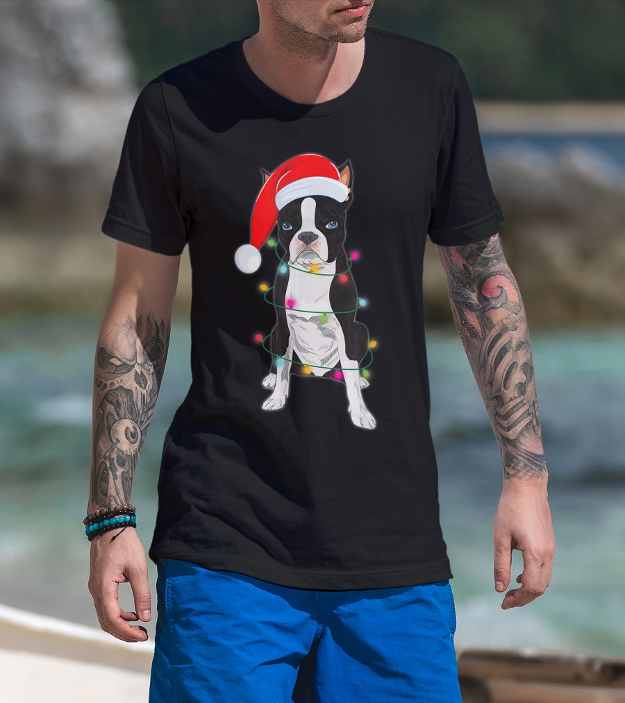 Boston Terrier Wrapped In Christmas Lights With Santa Hat T-Shirt