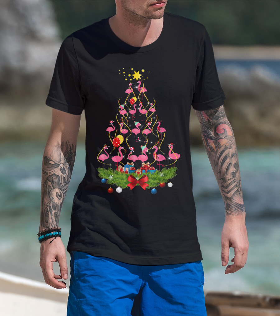 Pink Flamingo Christmas Tree With Santa Hats And Festive Decorations T-Shirt