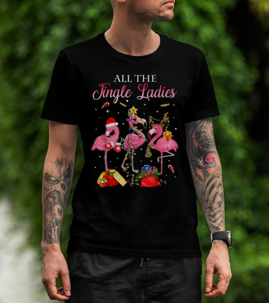 All The Jingle Ladies Christmas Pink Flamingo Santa Hats Presents Lights T-Shirt