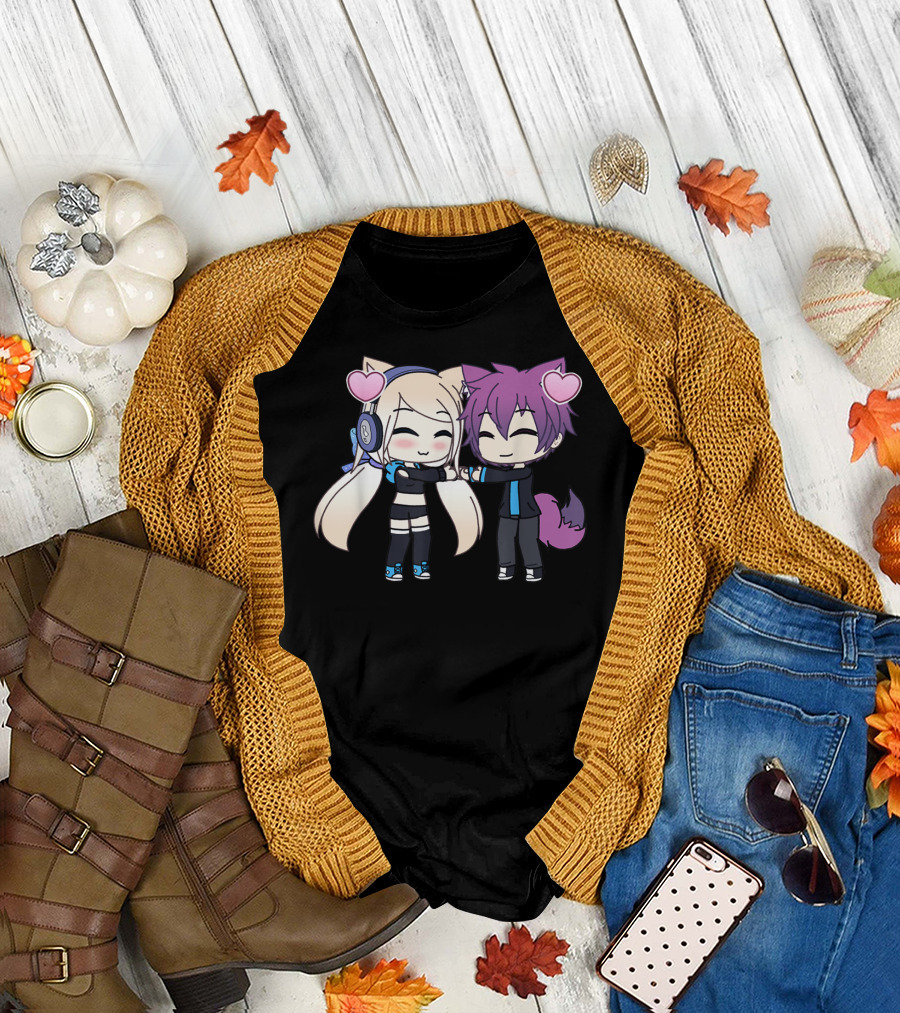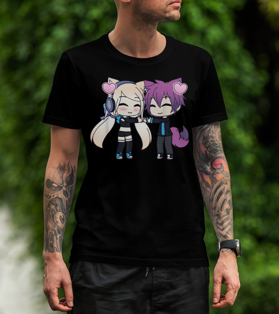 Cute Kawaii Chibi Anime Girl And Boy With Hearts And Cat Ears T-Shirt