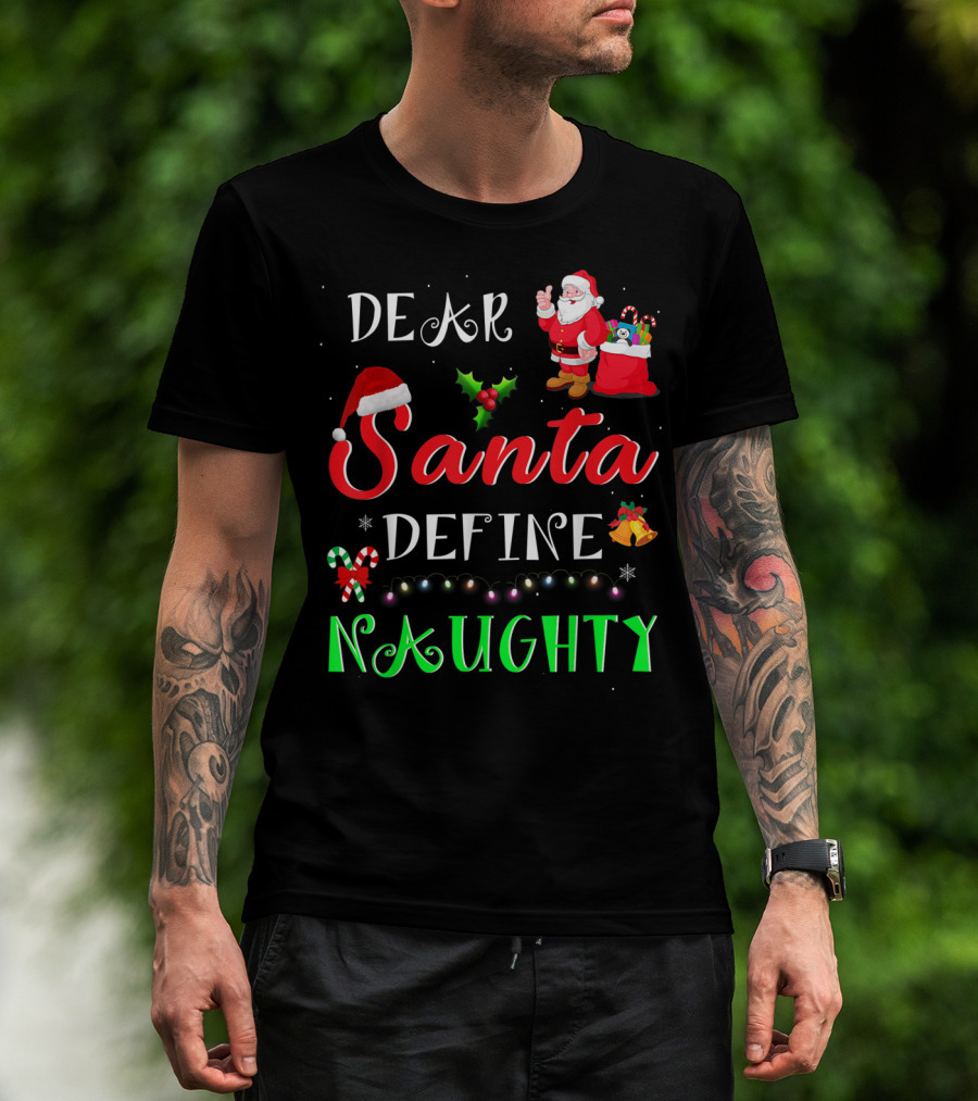 Dear Santa Define Naughty Santa Claus Hat Holly Candy Cane Christmas Lights Sack Of Gifts T-Shirt