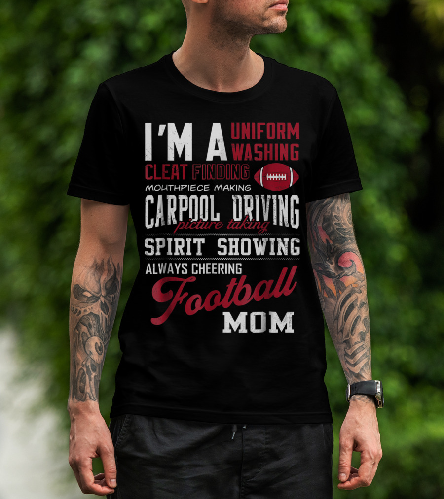 The I'm a Uniform Washing Cleat Finding Mouthpiece Making Carpool Driving Picture Taking Spirit Showing Always Cheering Football Mom T-shirt is designed for everyday wear and a consistent fit. Fabric is pre-shrunk ring-spun cotton with durable stitching. See the size chart below for exact measurements.