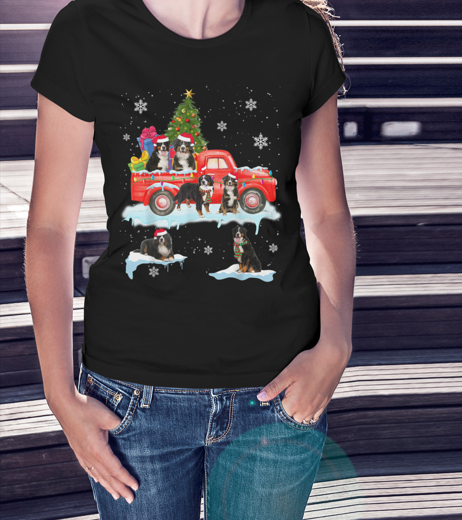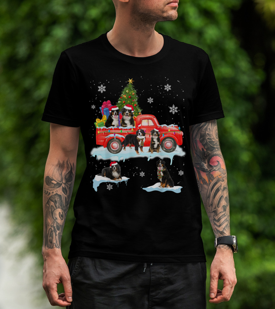 Bernese Mountain Dogs Christmas Red Truck Snowflakes T-Shirt