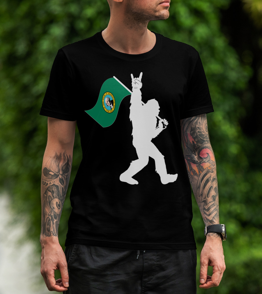Bigfoot Holding Washington State Flag Rock And Roll Gesture T-Shirt