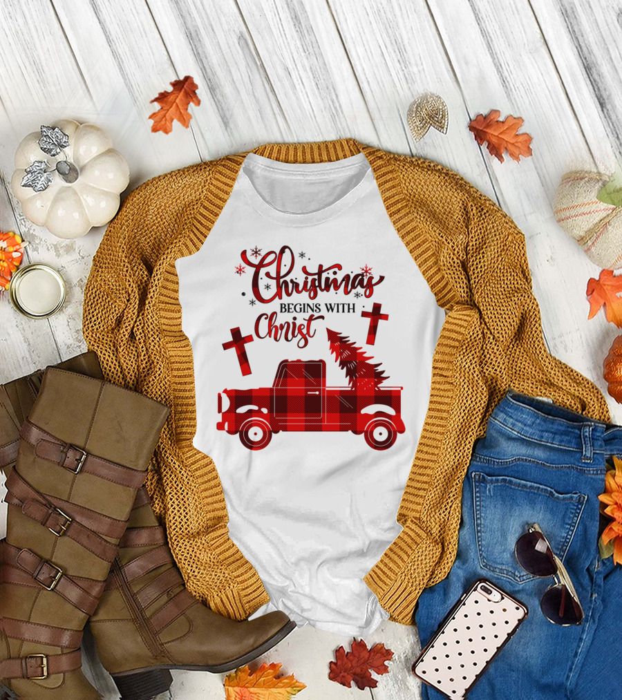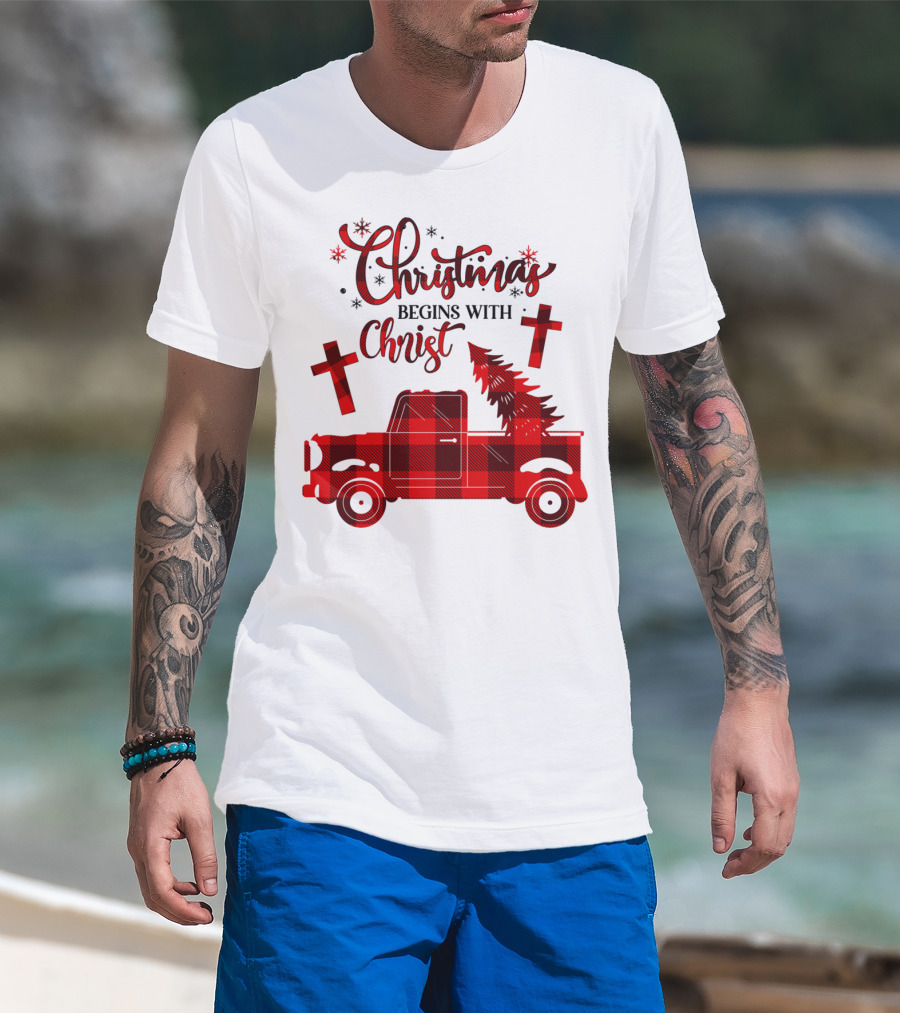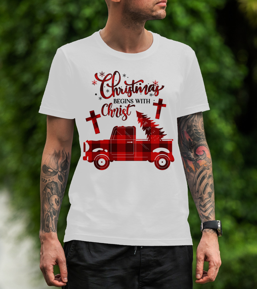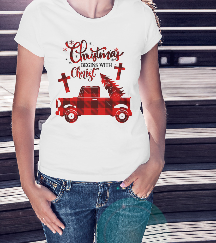 Christmas Begins With Christ Buffalo Plaid Red Truck With Tree And Crosses T-Shirt