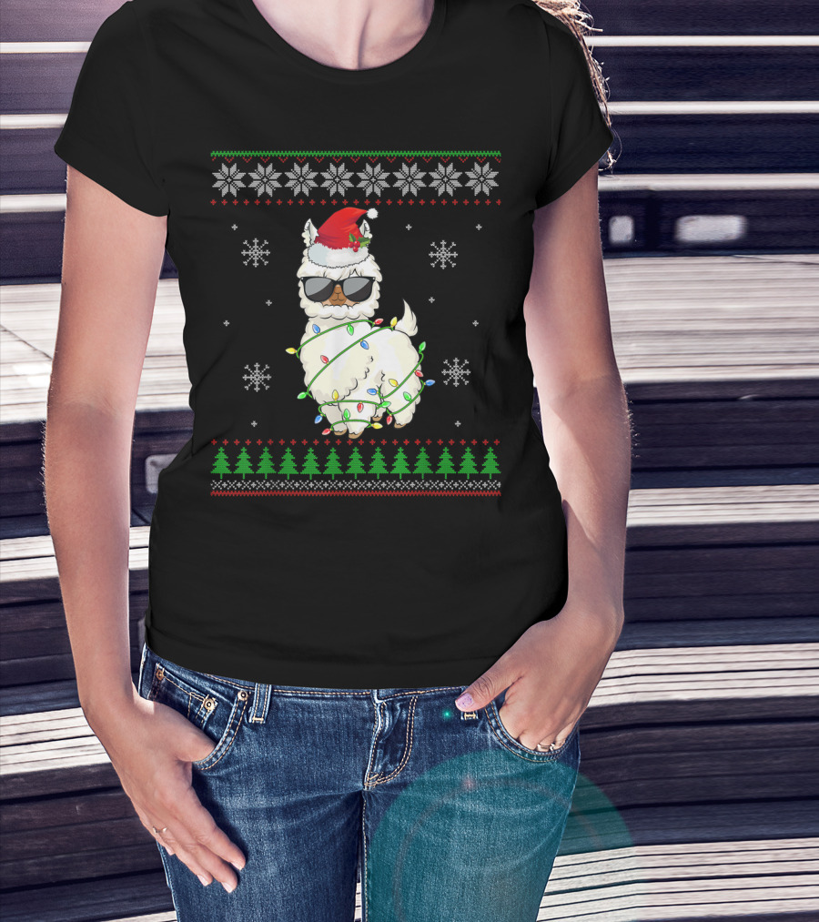 Santa Hat Sunglasses Llama Wrapped In Christmas Lights With Snowflakes And Trees T-Shirt