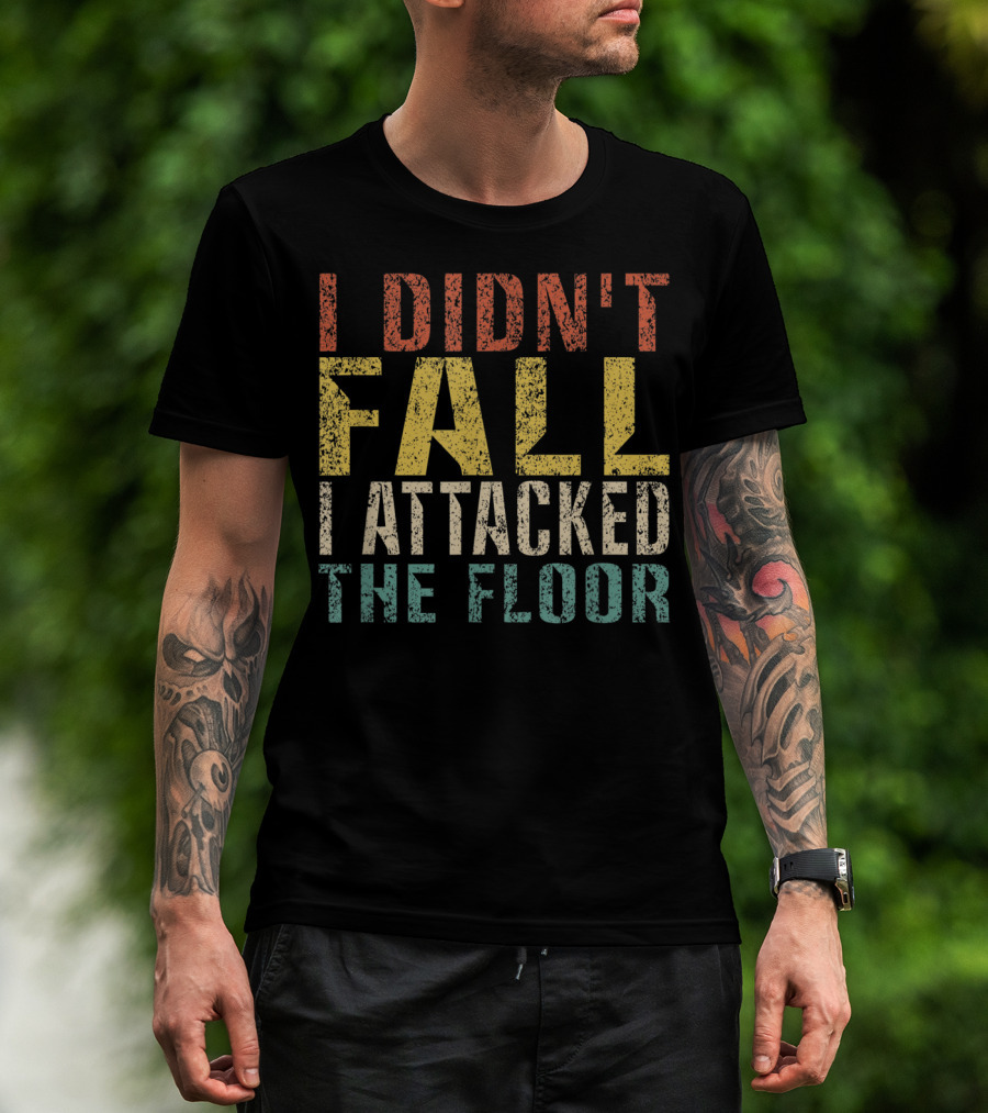 The I Didn't Fall I Attacked The Floor T-shirt is designed for everyday wear and a consistent fit. Fabric is pre-shrunk ring-spun cotton with durable stitching. See the size chart below for exact measurements.