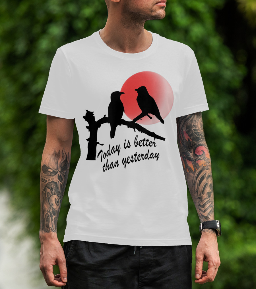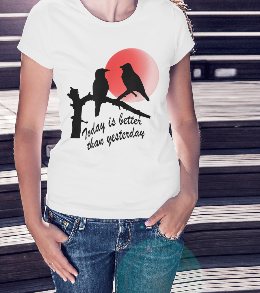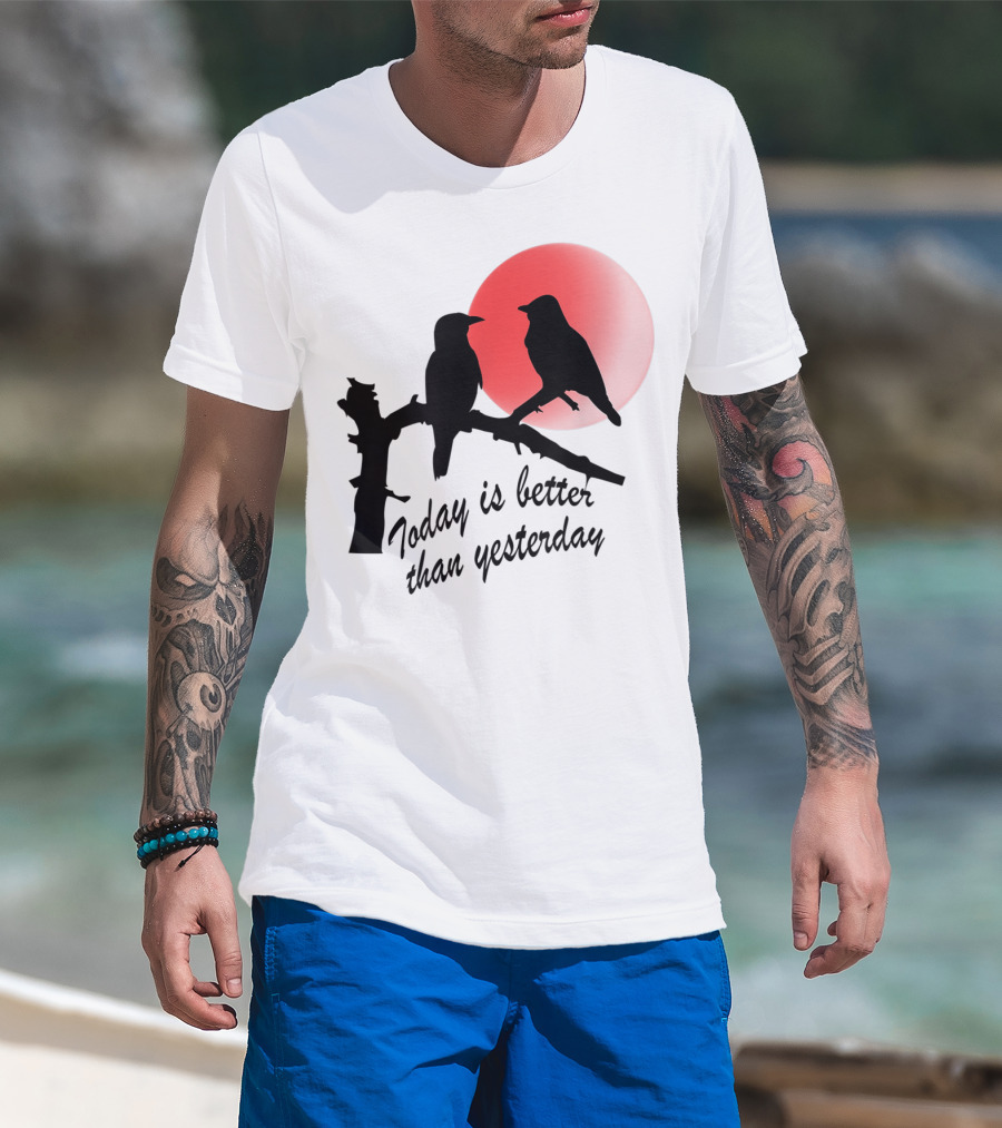 The Today Is Better Than Yesterday Bird Silhouettes At Sunrise T-shirt is designed for everyday wear and a consistent fit. Fabric is pre-shrunk ring-spun cotton with durable stitching. See the size chart below for exact measurements.