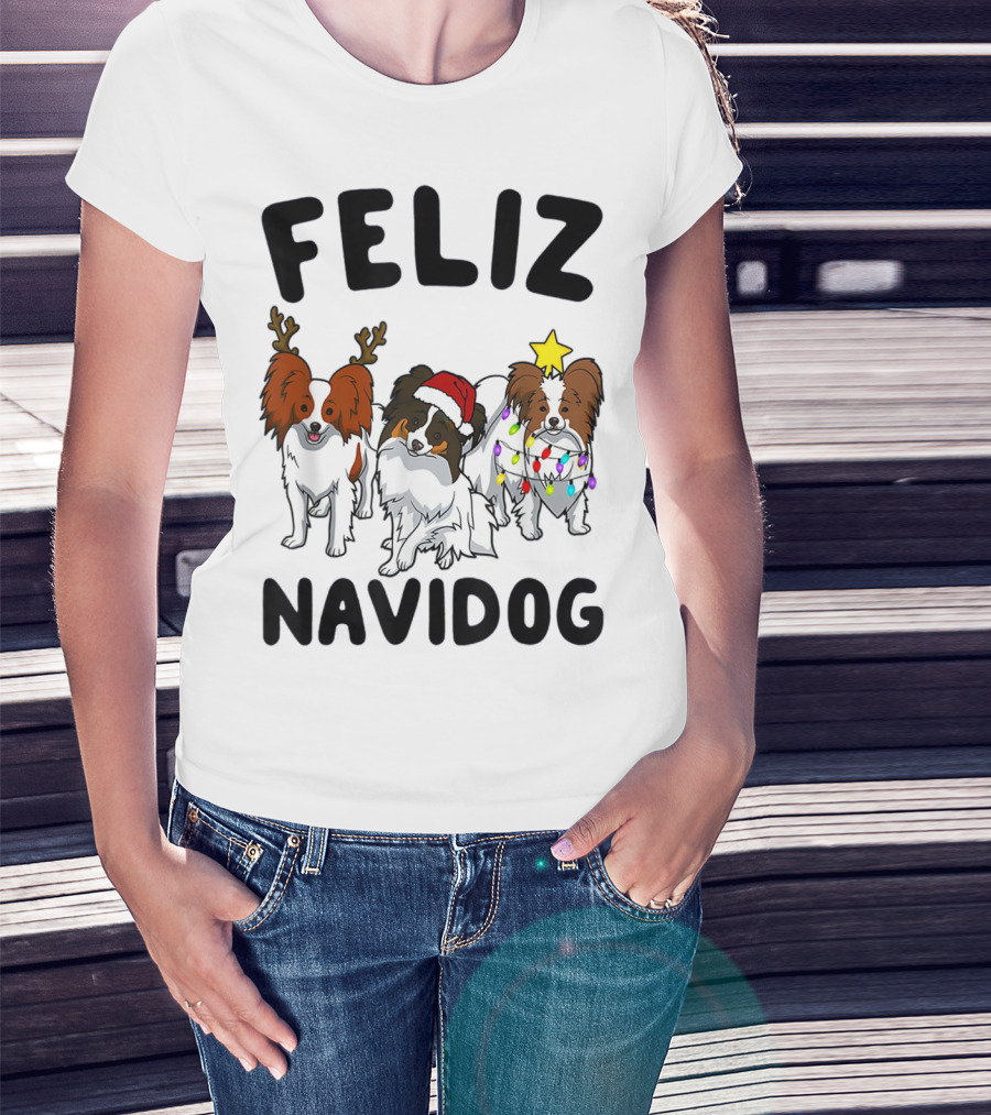 Feliz Navidog Funny Papillon Reindeer Santa Hat Christmas Lights T-Shirt