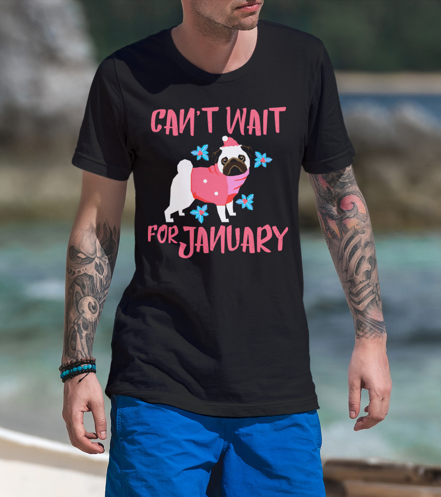 CAN'T WAIT FOR JANUARY PUG IN SANTA HAT AND PINK SCARF WITH SNOWFLAKES T-Shirt