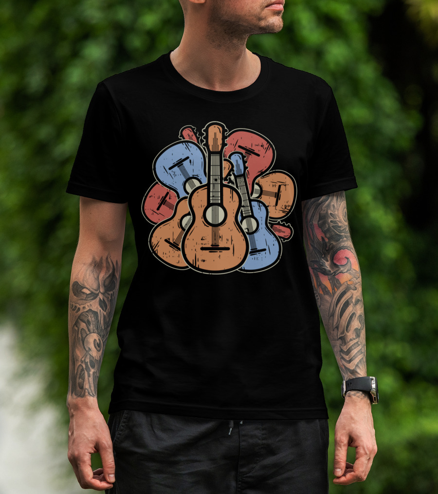 The Colorful Guitars And Ukuleles Funny Guitarist Musician T-shirt is designed for everyday wear and a consistent fit. Fabric is pre-shrunk ring-spun cotton with durable stitching. See the size chart below for exact measurements.
