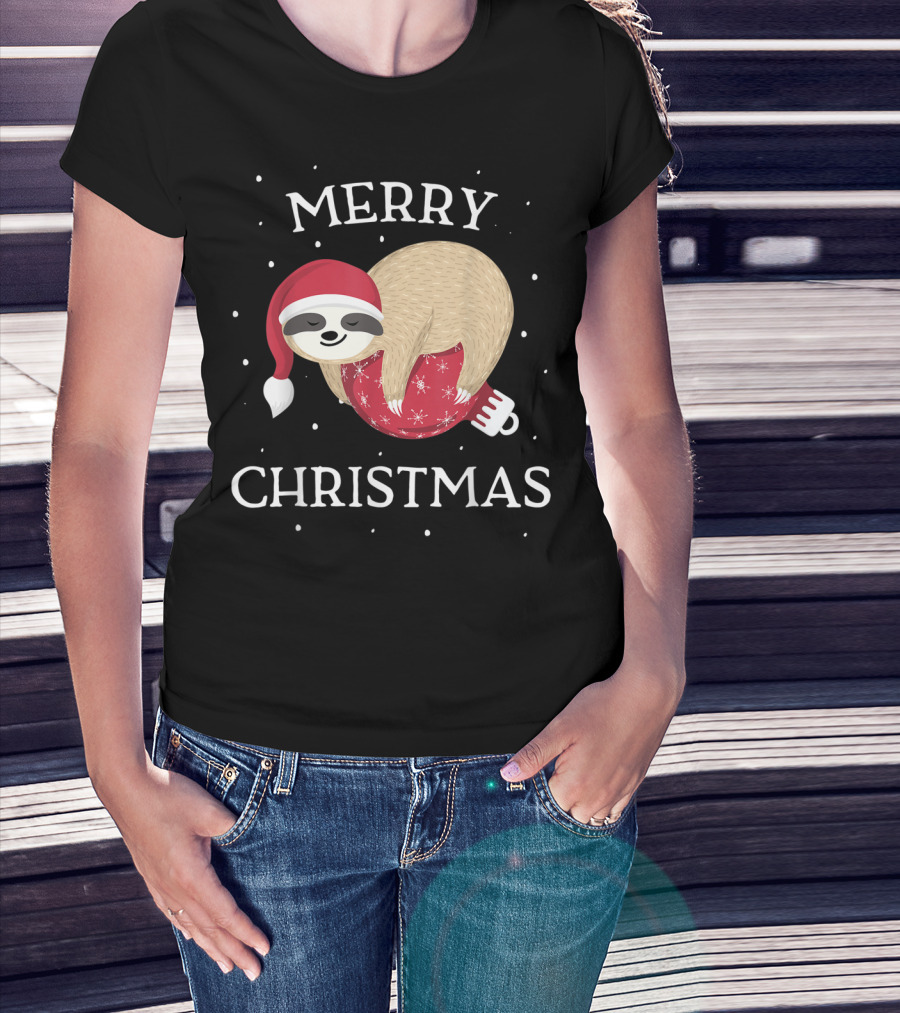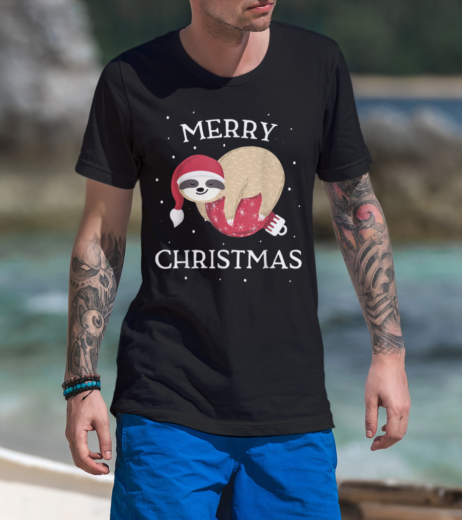 Merry Christmas Sloth Santa Hat Snowflakes T-Shirt
