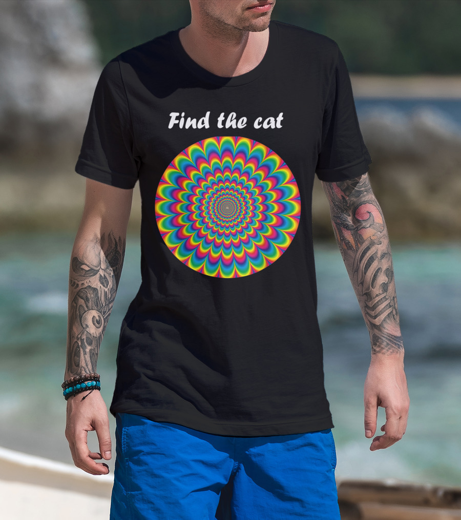 The Find The Cat Optical Illusion Spiral T-shirt is designed for everyday wear and a consistent fit. Fabric is pre-shrunk ring-spun cotton with durable stitching. See the size chart below for exact measurements.