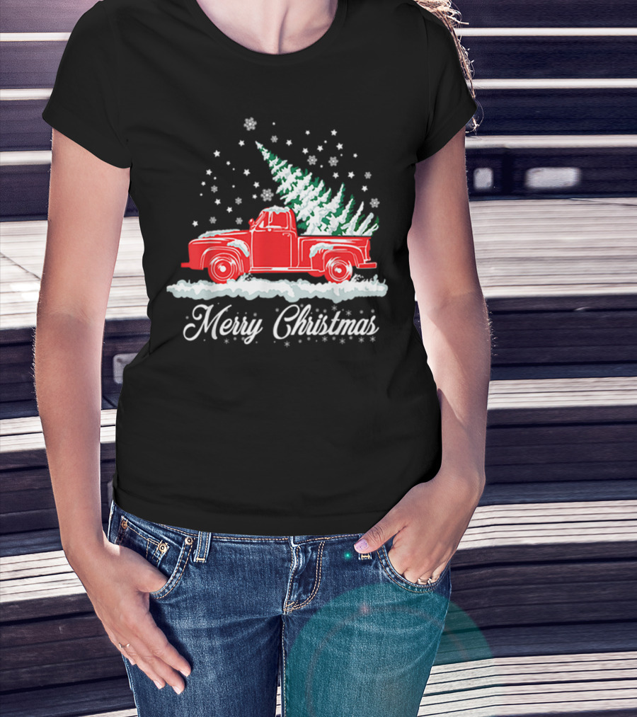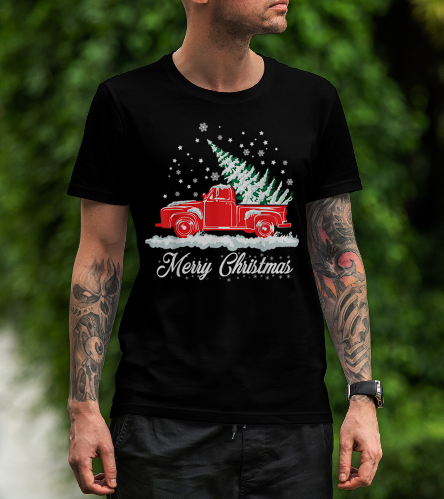 Merry Christmas Classic Old Red Truck With XMAS Tree Snowflakes T-Shirt