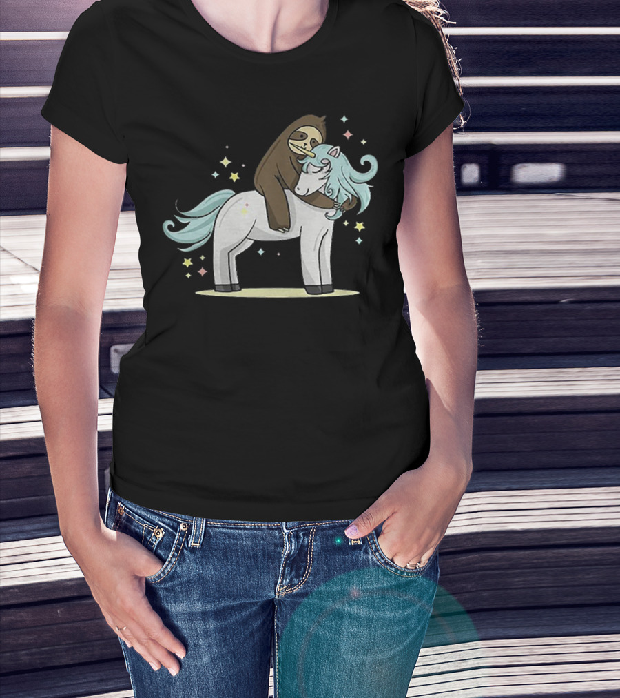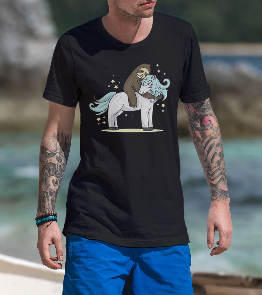 Sloth Hugging Magical Unicorn Surrounded By Sparkling Stars T-Shirt