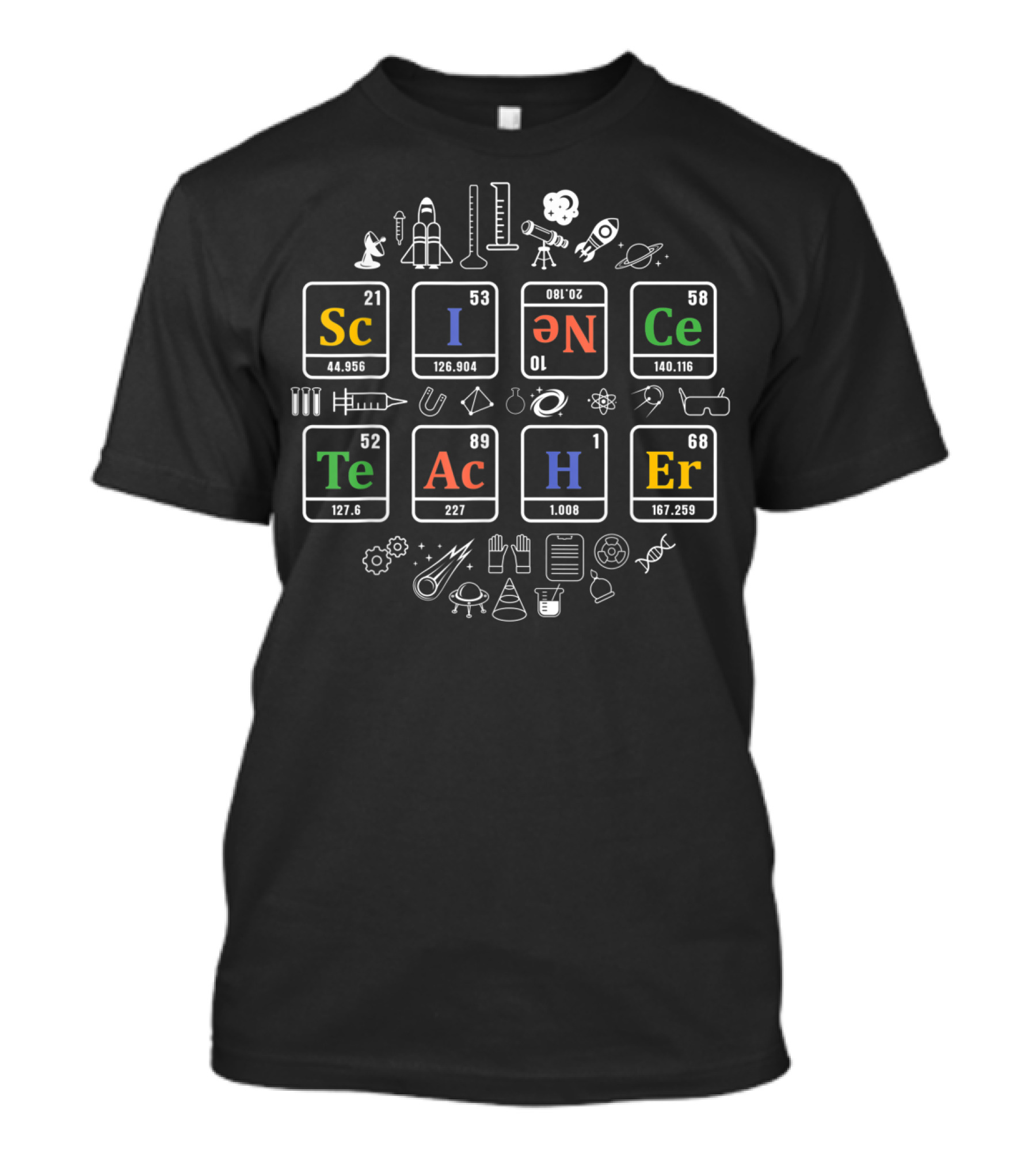 The Science Teacher Periodic Table with Chemistry Icons T-shirt is designed for everyday wear and a consistent fit. Fabric is pre-shrunk ring-spun cotton with durable stitching. See the size chart below for exact measurements.