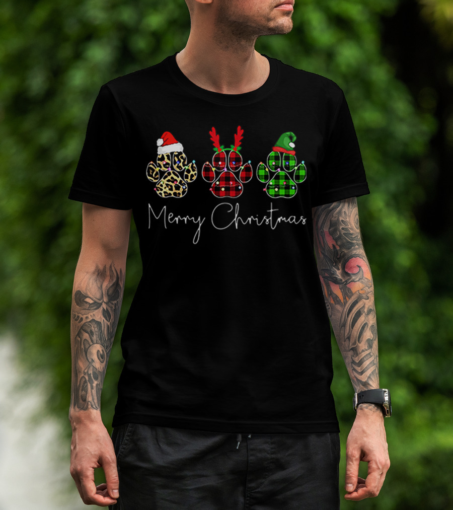 Merry Christmas Bear Paw Leopard Santa Antlers Plaid T-Shirt