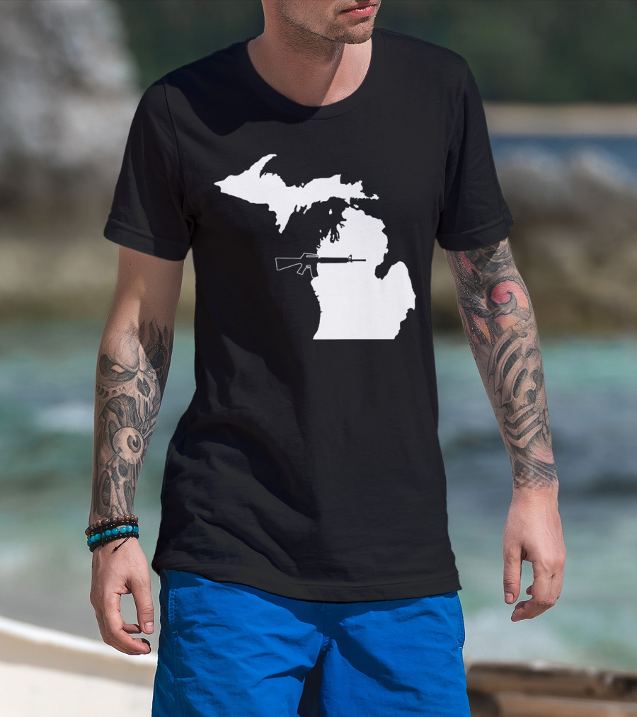 The Michigan Shape with Tactical Gun T-shirt is designed for everyday wear and a consistent fit. Fabric is pre-shrunk ring-spun cotton with durable stitching. See the size chart below for exact measurements.