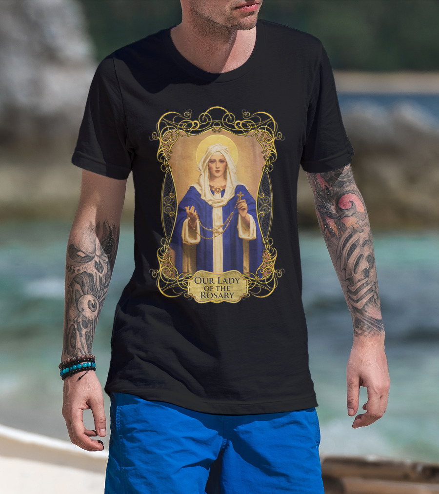 Our Lady Of The Rosary Catholic Prayer Blessed Virgin Mary Icon With Rosary Beads And Cross T-Shirt