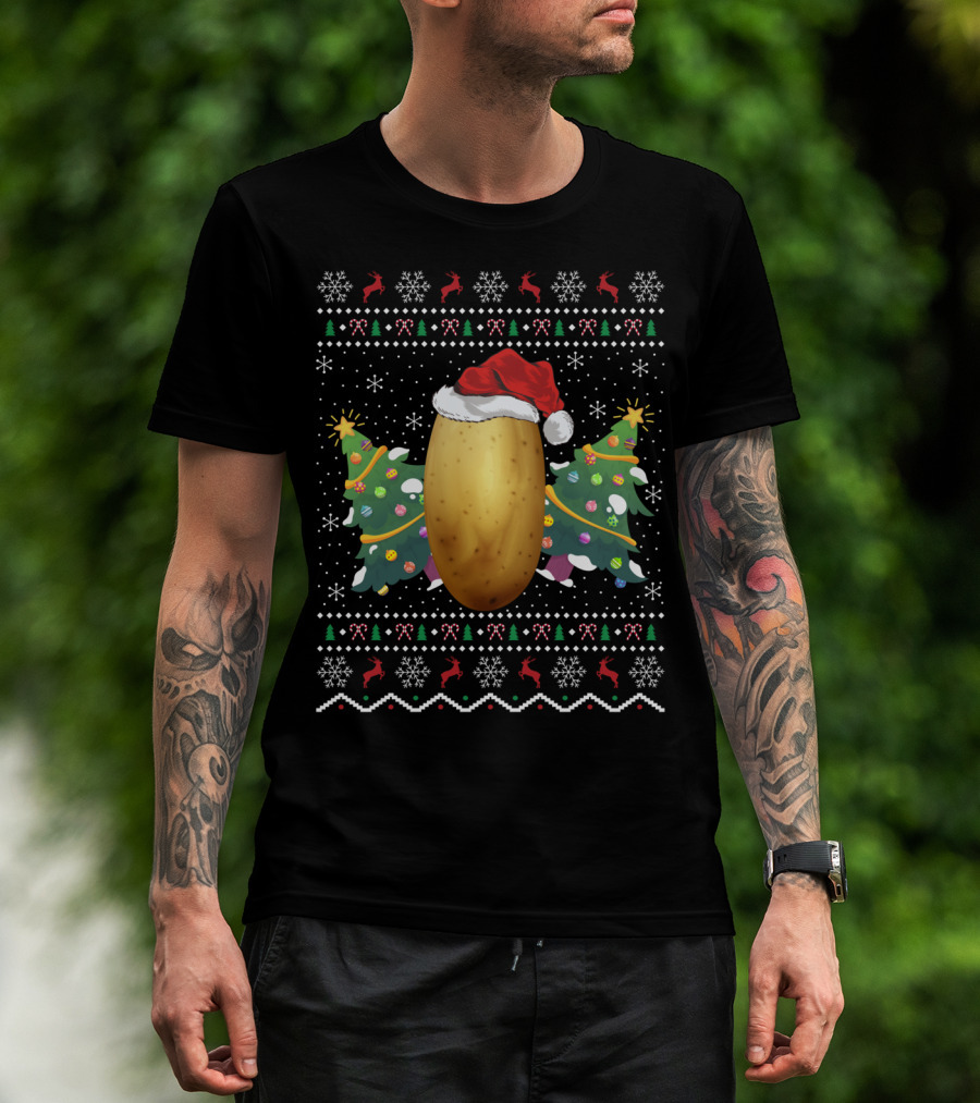 Potato Lover Christmas Ugly Sweater Santa Hat Reindeer Snowflakes Christmas Tree T-Shirt