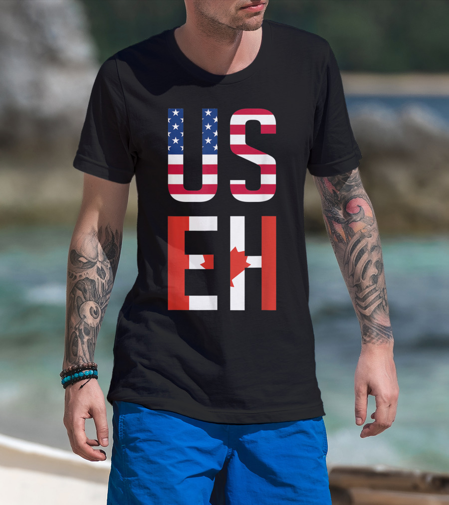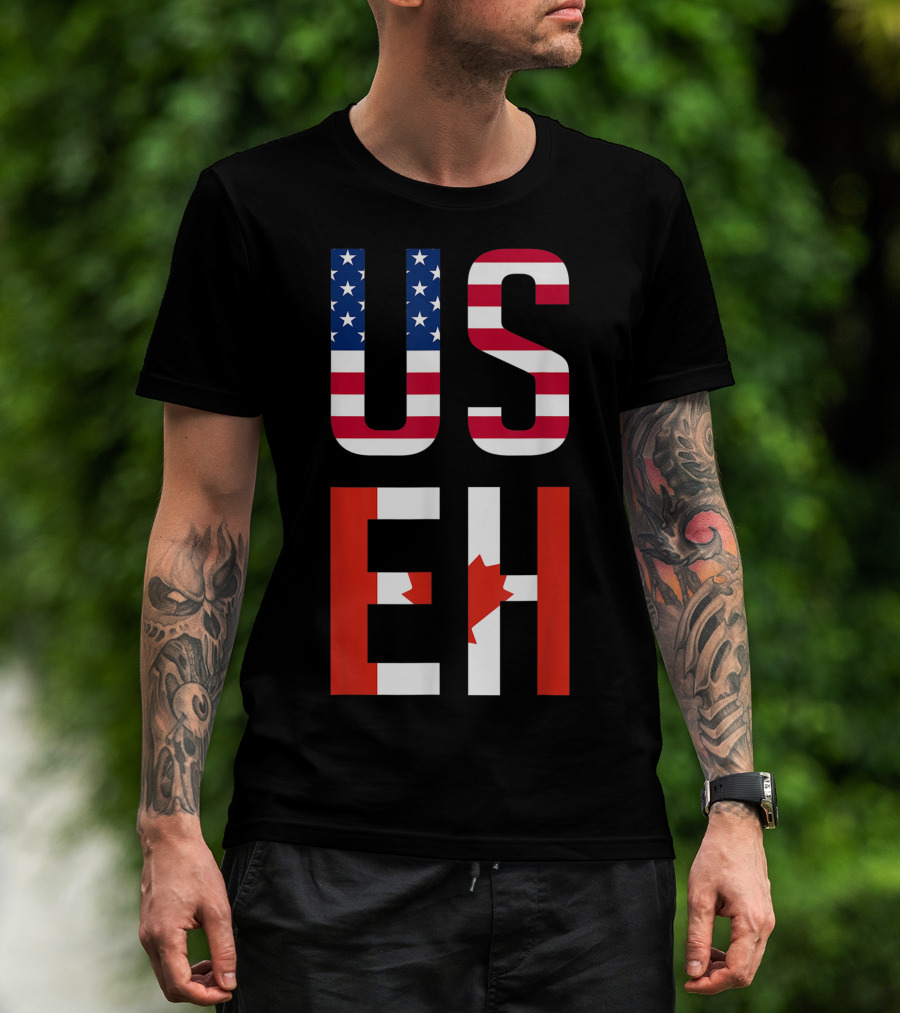 The US Eh American Canadian Flag Contrast T-shirt is designed for everyday wear and a consistent fit. Fabric is pre-shrunk ring-spun cotton with durable stitching. See the size chart below for exact measurements.