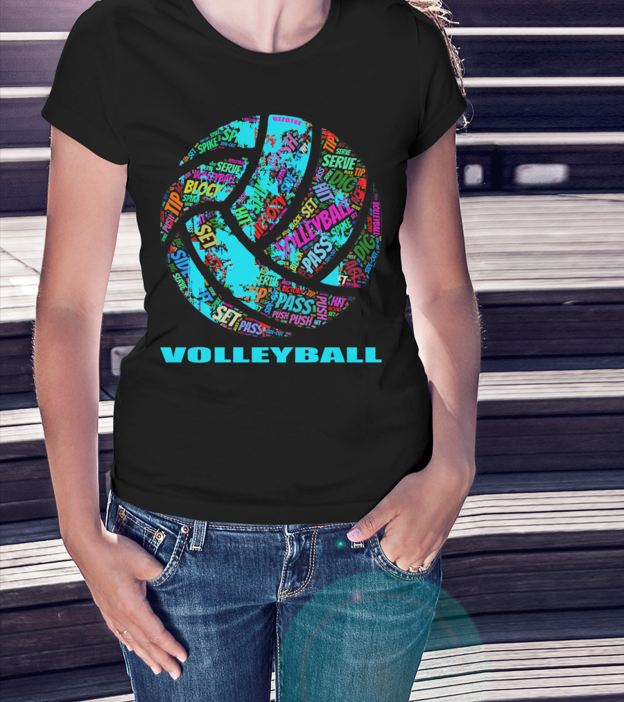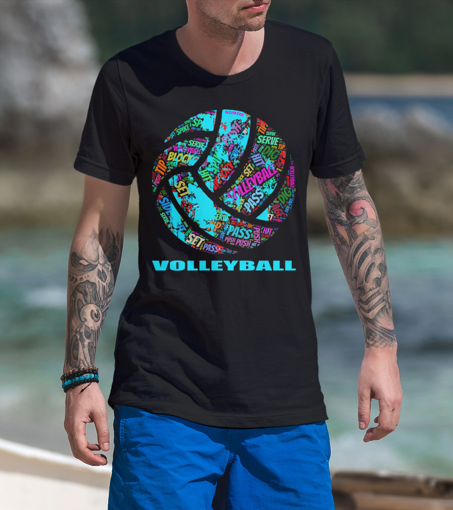 Volleyball Block Serve Dig Set Pass Spike Victory Words Colorful Ball T-Shirt