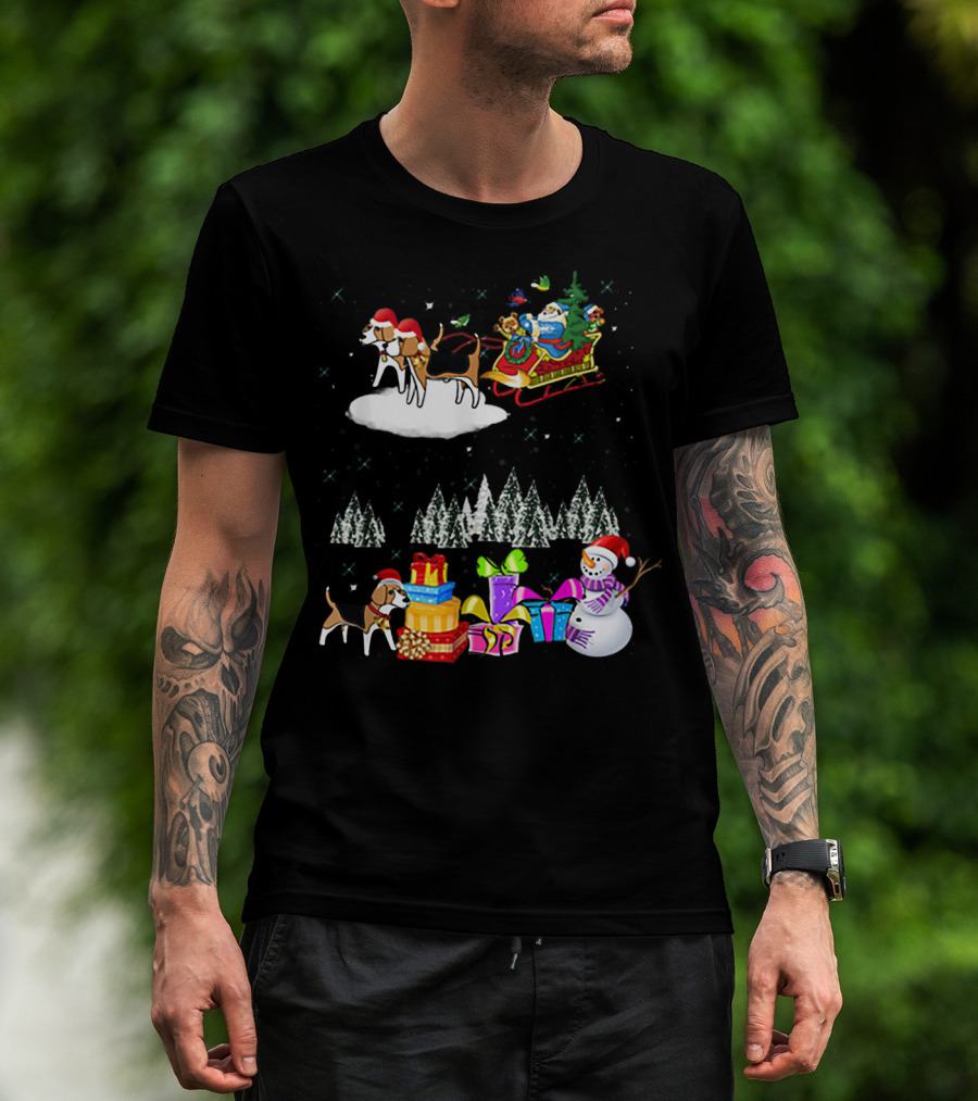 Beagle Reindeer Christmas Santa Sleigh Snowman Presents Trees Moon T-Shirt
