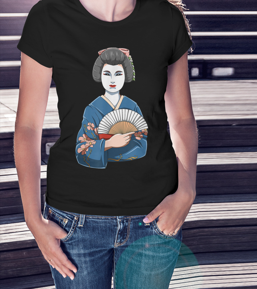 The Geisha Girl Traditional Japanese Kimono Fan Blossoms T-shirt is designed for everyday wear and a consistent fit. Fabric is pre-shrunk ring-spun cotton with durable stitching. See the size chart below for exact measurements.