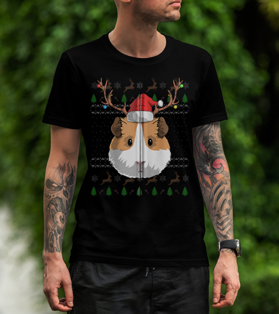 Guinea Pig Santa Claus Hat Reindeer Antlers Christmas Trees And Snowflakes T-Shirt