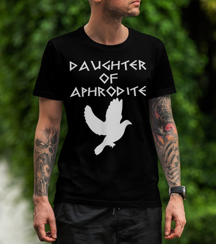 The Daughter Of Aphrodite Graphic with Dove T-shirt is designed for everyday wear and a consistent fit. Fabric is pre-shrunk ring-spun cotton with durable stitching. See the size chart below for exact measurements.
