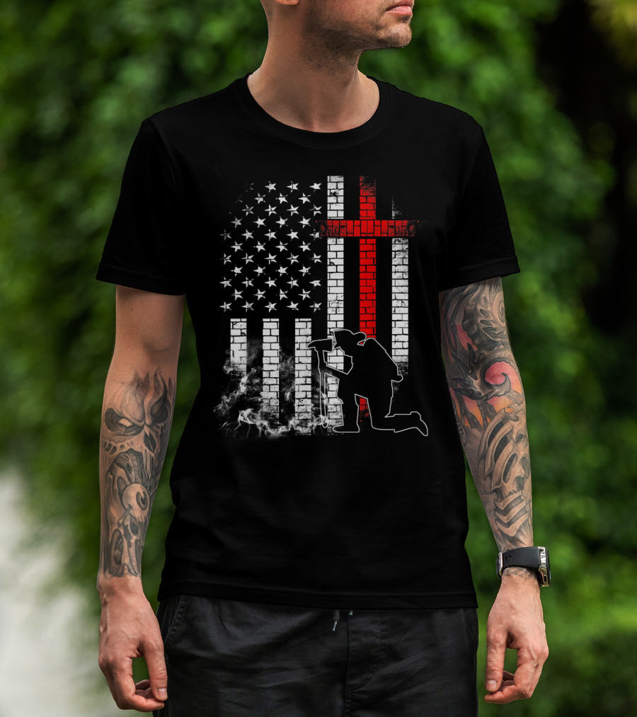 Fireman Kneeling With Axe Over American Flag And Thin Red Line Cross T-Shirt