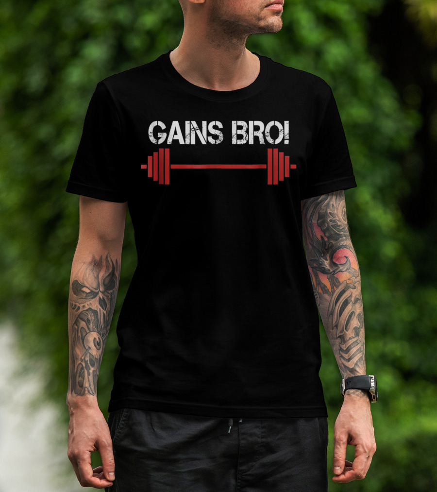 Gains Bro Workout Weightlifting Barbell Funny Gains T-Shirt
