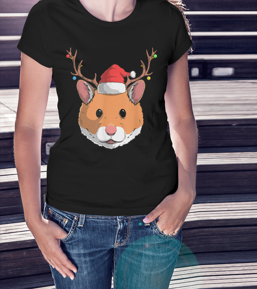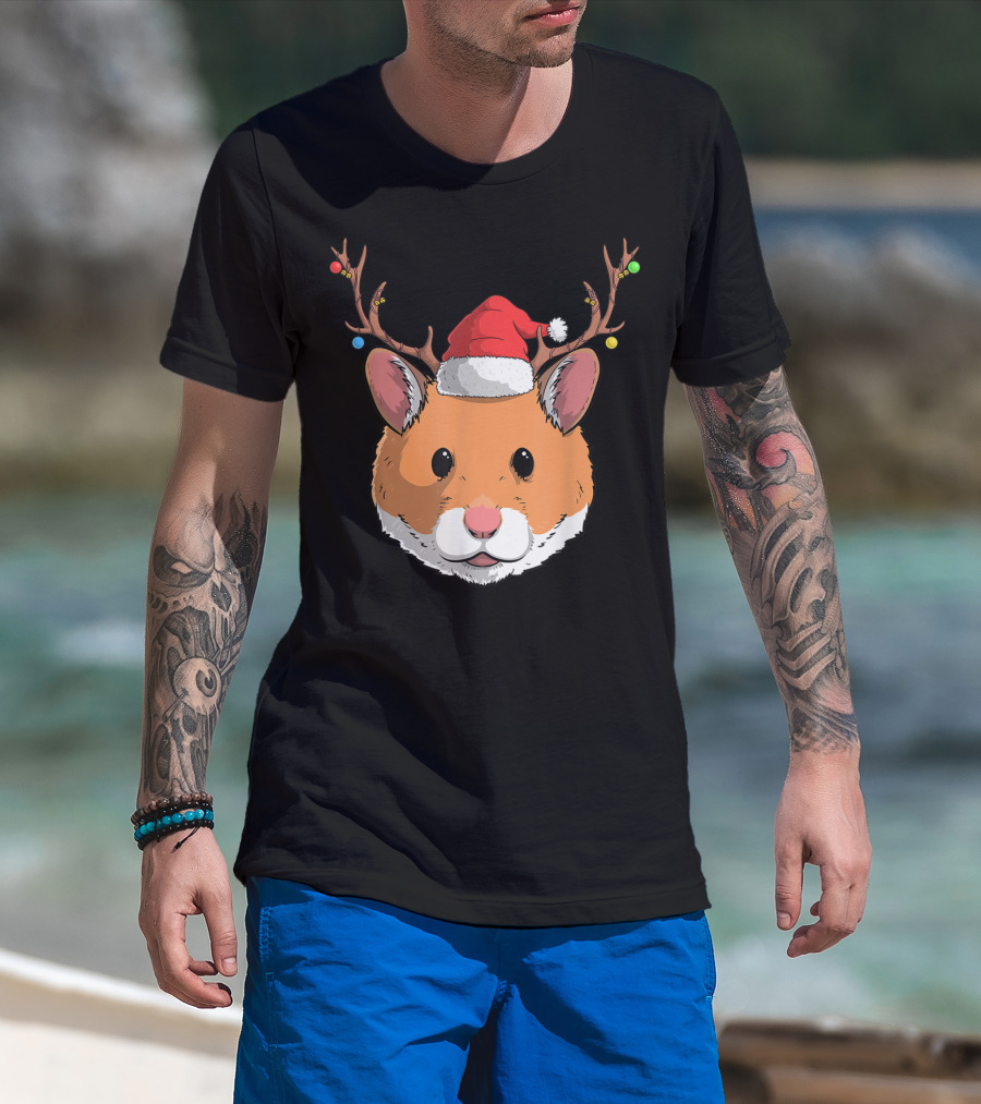 Hamster With Santa Claus Hat And Reindeer Antlers Christmas Holiday T-Shirt