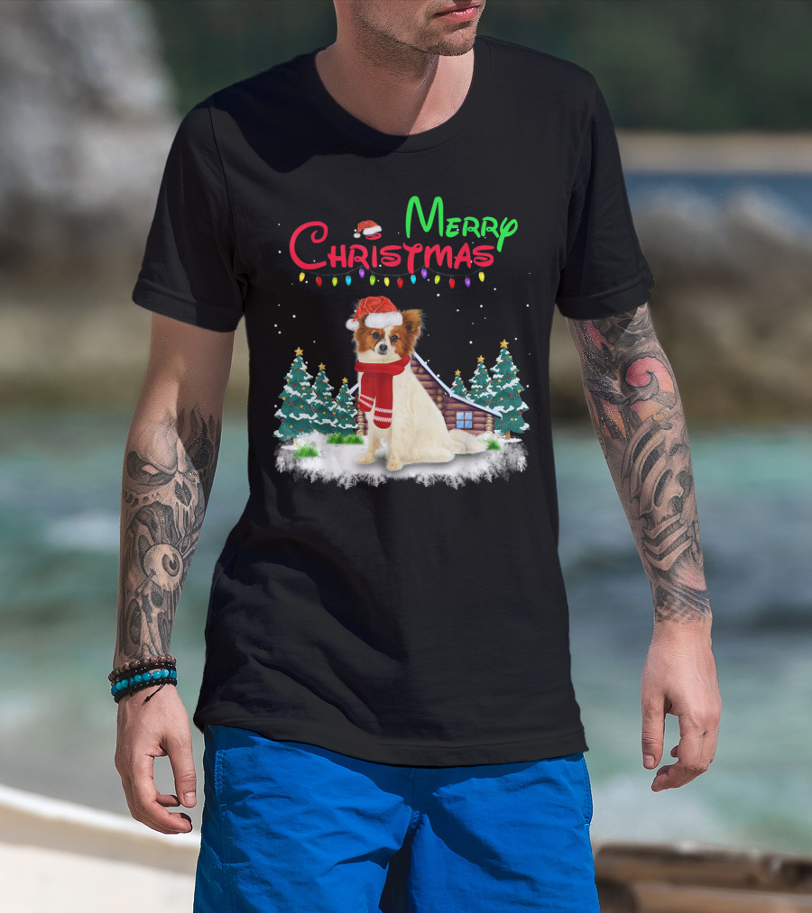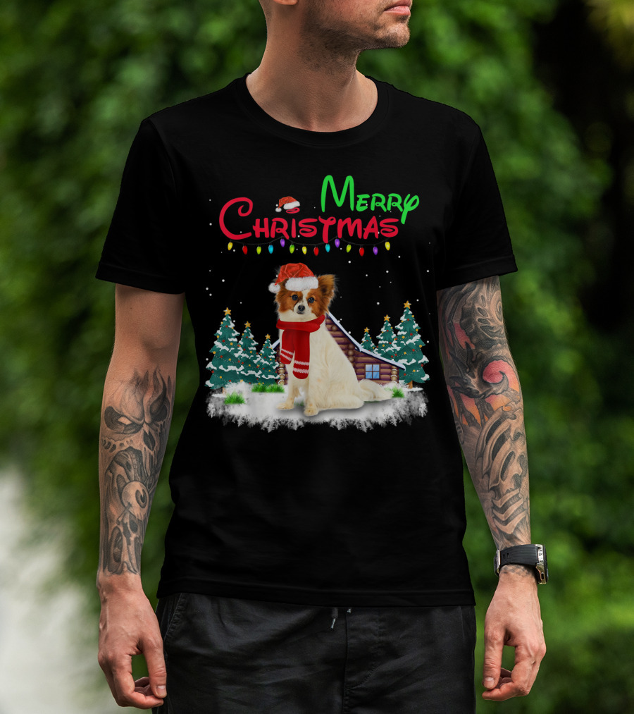 Papillon Dog With Santa Hat And Christmas Lights In Snowy Holiday Scene T-Shirt