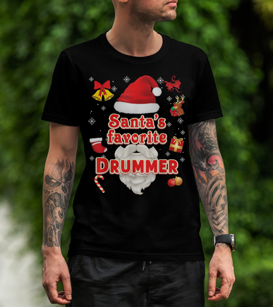 The Santa's Favorite Drummer Christmas Santa Hat Reindeer Gift Bells Snowflakes Candy Cane Ornaments T-shirt is designed for everyday wear and a consistent fit. Fabric is pre-shrunk ring-spun cotton with durable stitching. See the size chart below for exact measurements.