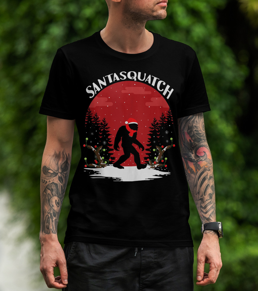 Santasquatch Christmas Funny Bigfoot Santa Hat Snowy Forest Trees T-Shirt