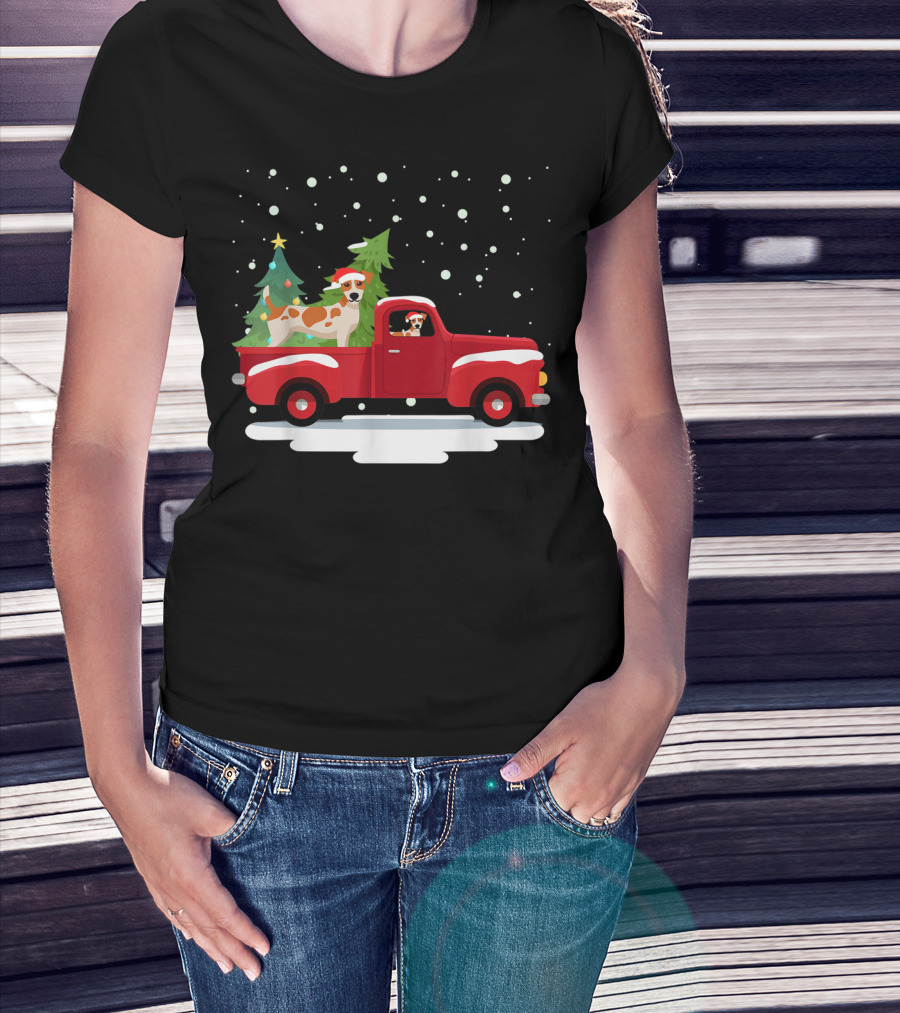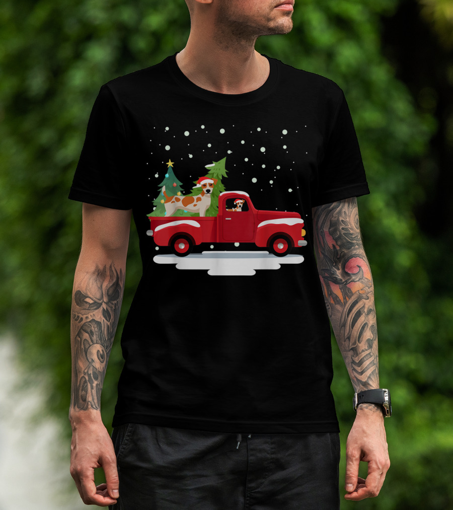 Jack Russell Terrier Santa Christmas Truck Holiday Scene Snowflakes And Trees T-Shirt